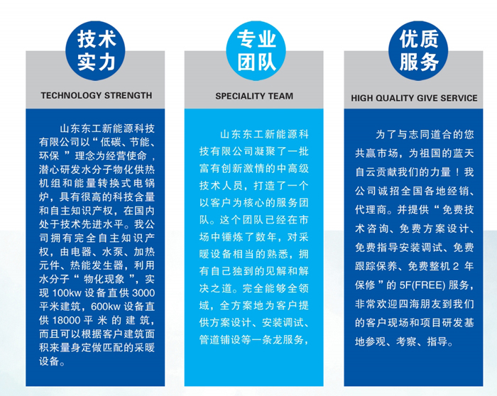 公司 2010年被山东知识产权授予《山东省专业创造能力培育单位》,2008年12月至2016年12月连续9年一直被山东省科学技术厅评为《山东明星企业》、2022年被评为“国家级高新技术企业”并获得环境管理体系认证证书、职业健康安全管理体系认证证书、质量管理体系认证证书。2020年山东东工新能源科技有限公司以“低碳、节能、环保”为经营使命潜心研发水分子物化供热机组,该产品具有很高的科技含量,赋予采暖设备以全新的特点和内涵,在国内处于技术先进水平,突破了 1kw 供 暖 10 平米的“魔咒”,实现了 1kw 供暖 30 平米的突破,即将引爆中国电采暖的一场革命。